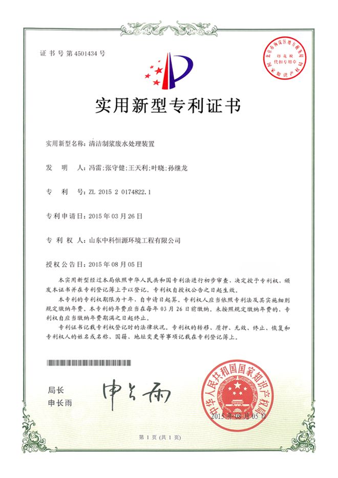 我司申請的“清潔制漿廢水處理裝置”于2015年8月5日獲得國家知識產(chǎn)權局頒發(fā)的實(shí)用新型專(zhuān)利證書(shū)。